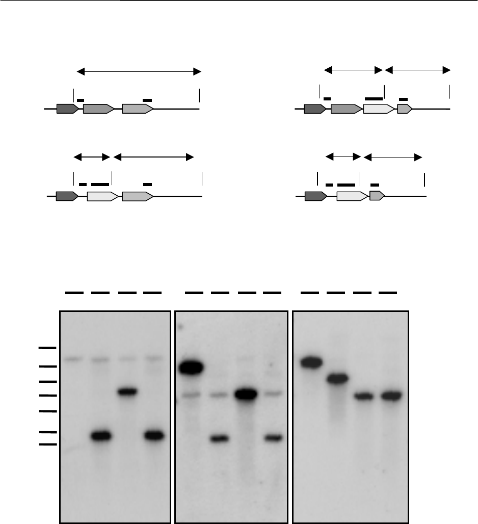 Southern-Blot-Analyse mit A: der Sonde V, B: der Sonde IV bzw. C: der Sonde VI untersucht.